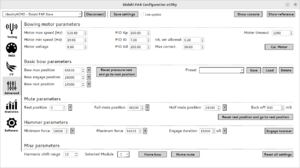 The first two parameters on the top left, Motor max speed and Motor min speed are somewhat special in that they cannot be changed. These two speeds are measured by clicking the Cal. Motor-button on the lower right and denotes the physical maximum speed that the bowing motor can reach, and the lowest speed that it can stably obtain while fed a constant pulse width. A few things needs to be noted here; these two speeds are to be measured without load, meaning when the bowing wheel is not touching the string. For this reason the bowing motor may not be able to reach its maximum speed depending on the amount of pressure that is applied. Furthermore the lowest speed is almost never able to be obtained with any pressure applied because of inertia. The minimum and maximum speeds are also a result of the Motor voltage, if this latter value is changed for some reason you should run the motor speed calibration again by clicking the Cal. Motor-button. The existence of these parameters are mainly for internal use by other calibration functions, the motor voltage however could be beneficial to tweak in order to obtain lower speeds for lower pitched strings.